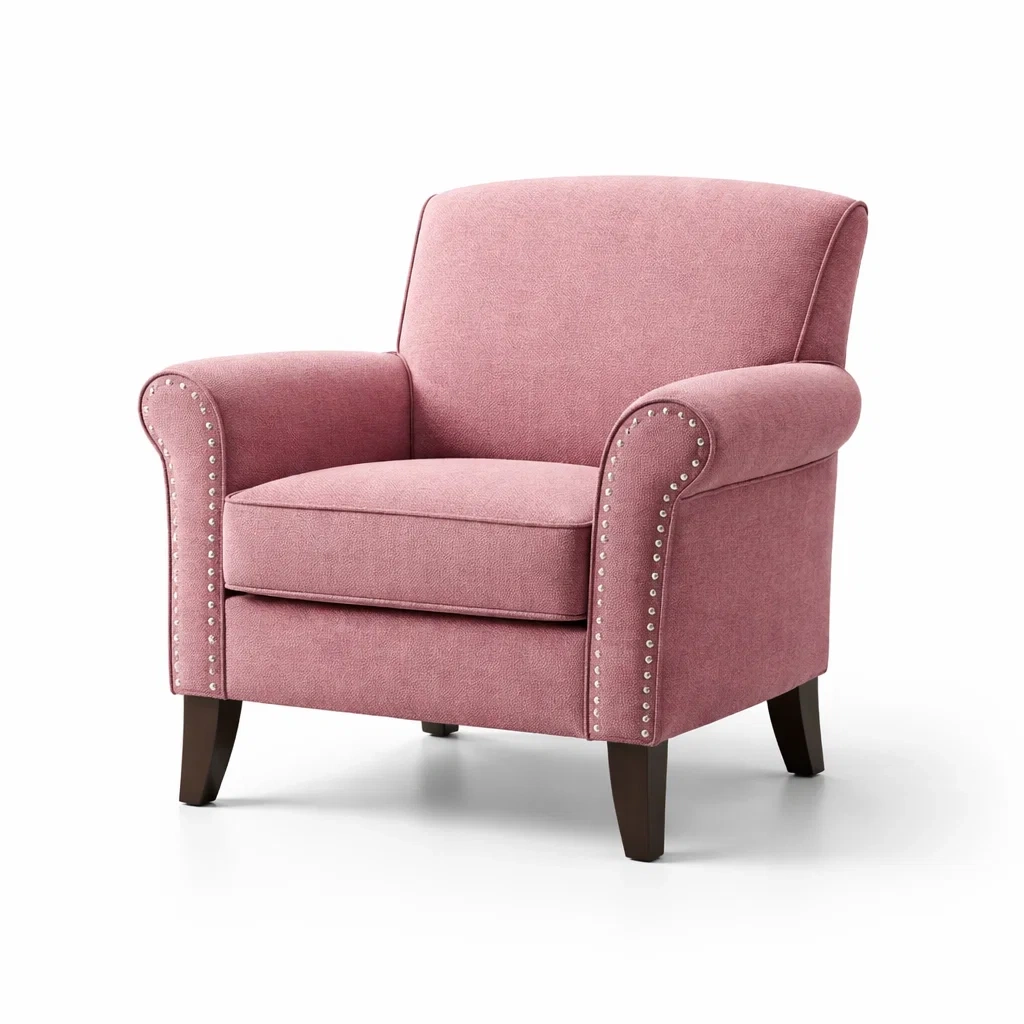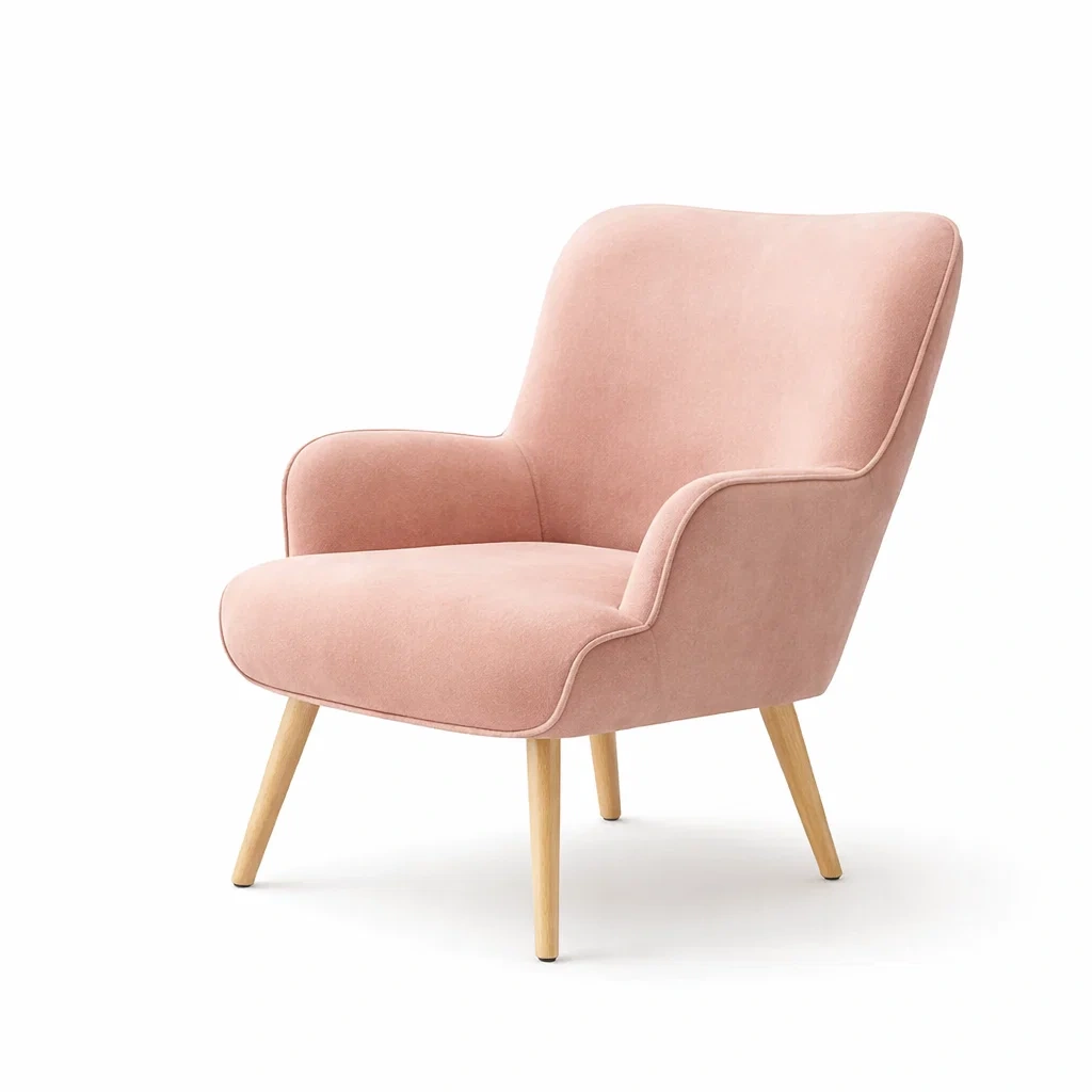 Poltrona in velluto colore rosa con gambe in legno di quercia
