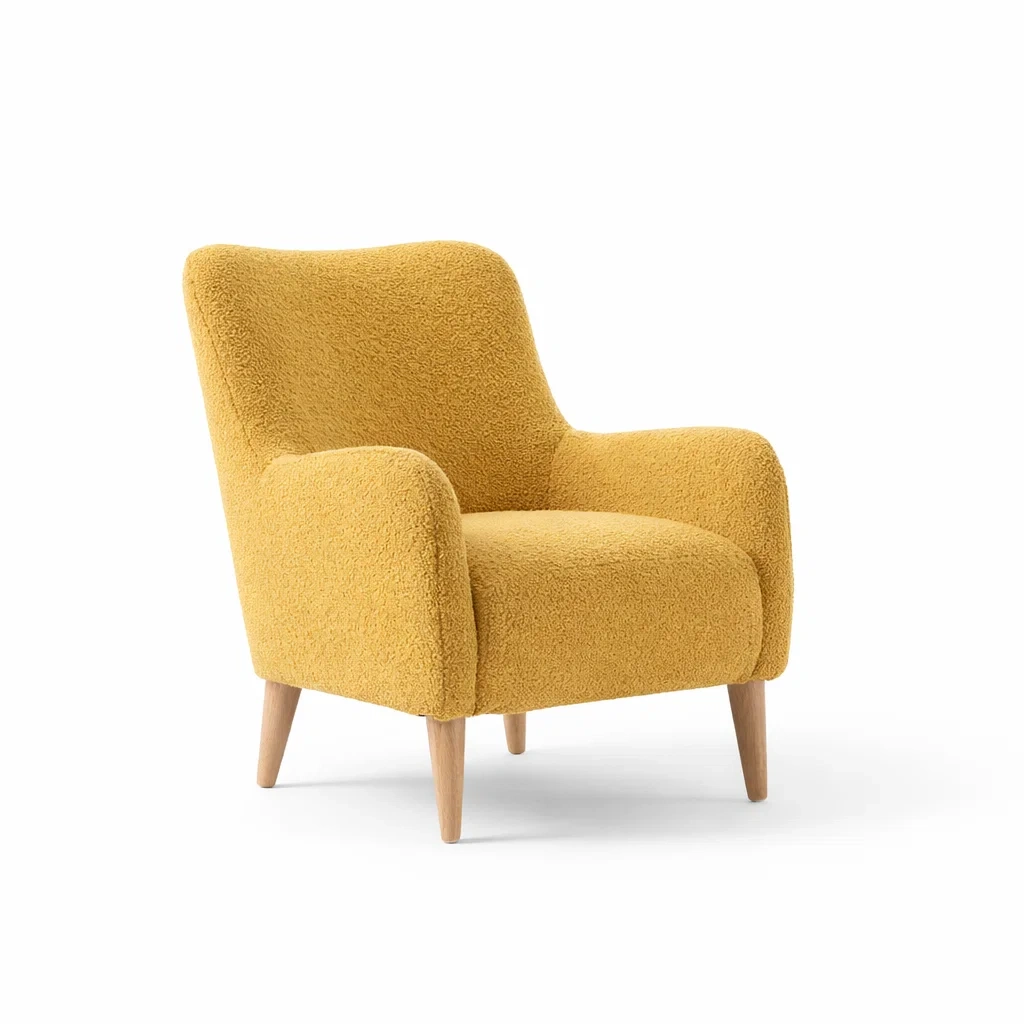 Poltrona in tessuto bouclé colore giallo con gambe in legno