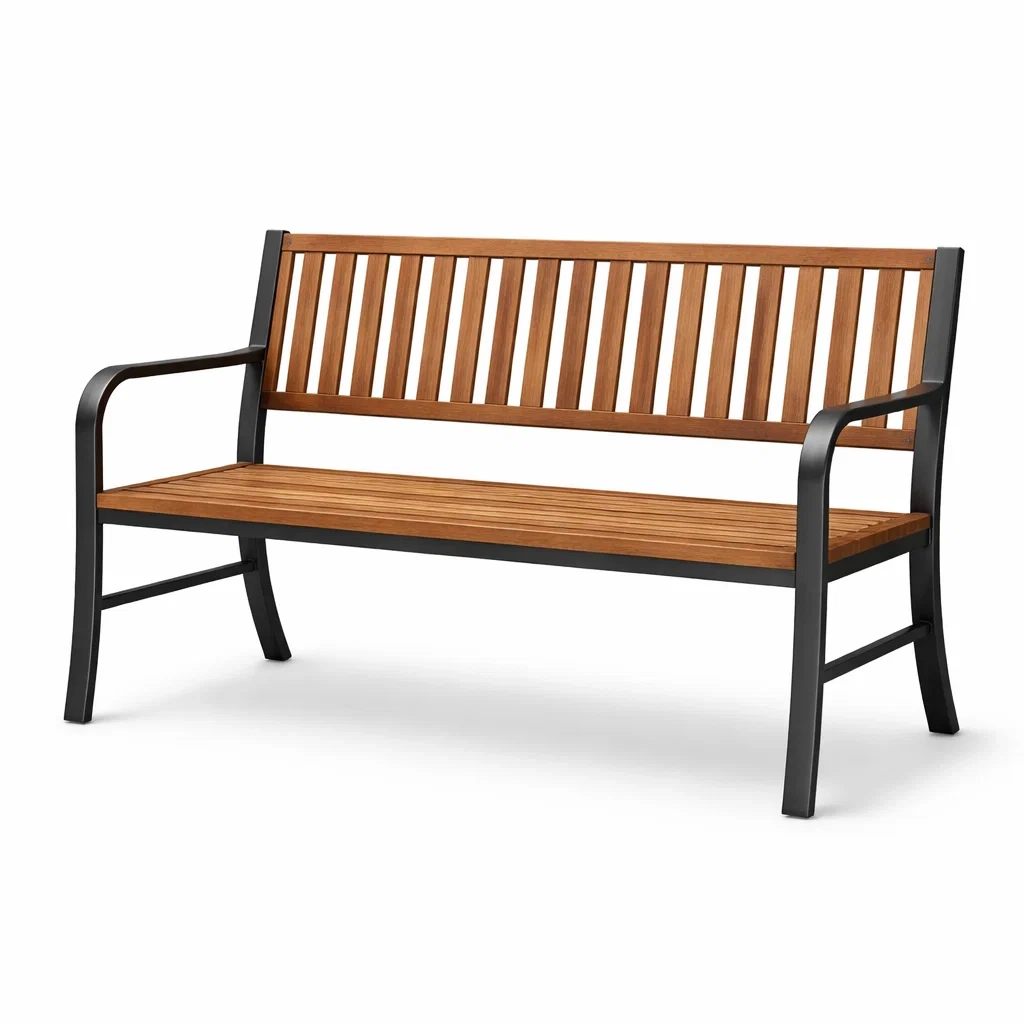 Questa panca è realizzata con una struttura in metallo e una superficie in legno massello. La sua capacità di carico è di 250 kg. I braccioli curvi migliorano la comodità. Adatta per l'uso esterno. È consigliata la manutenzione regolare del legno per garantirne la durata.