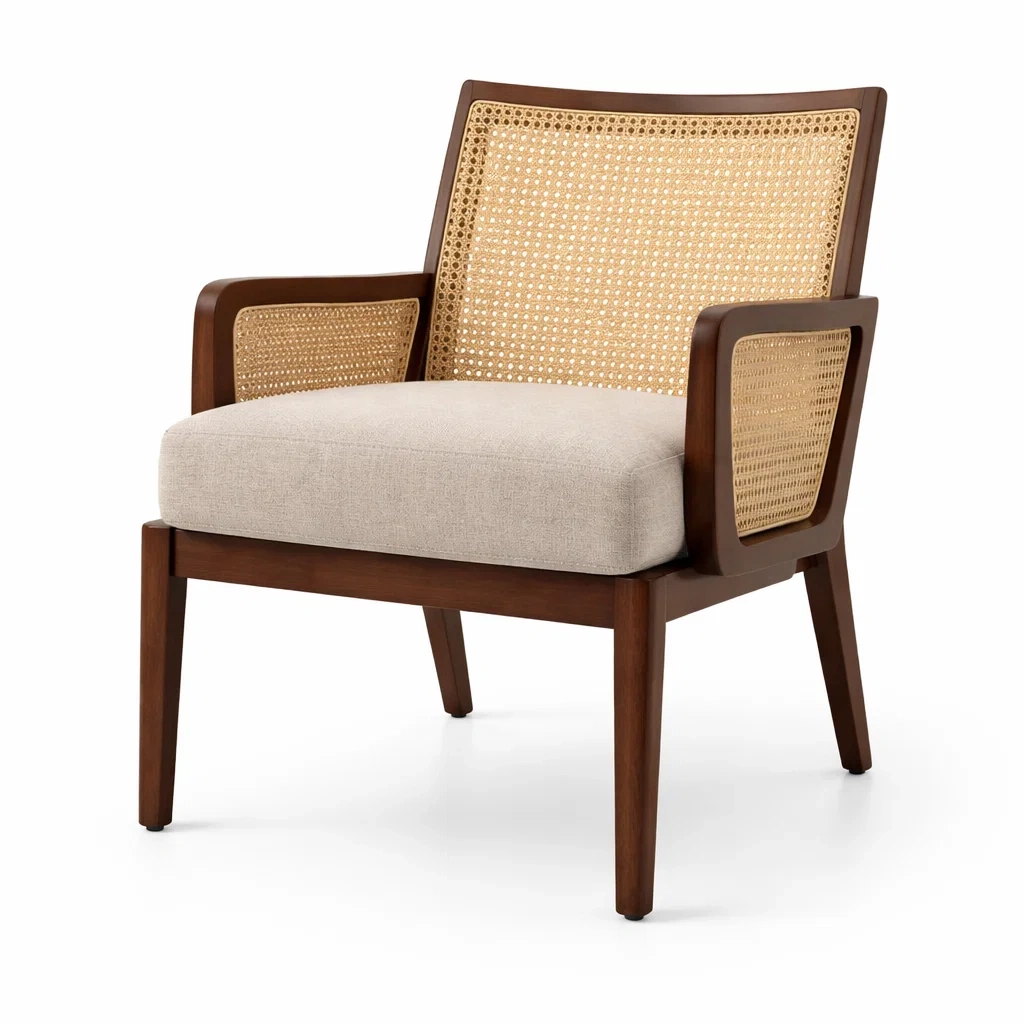 Poltrona in legno e rattan con cuscino in tessuto colore beige